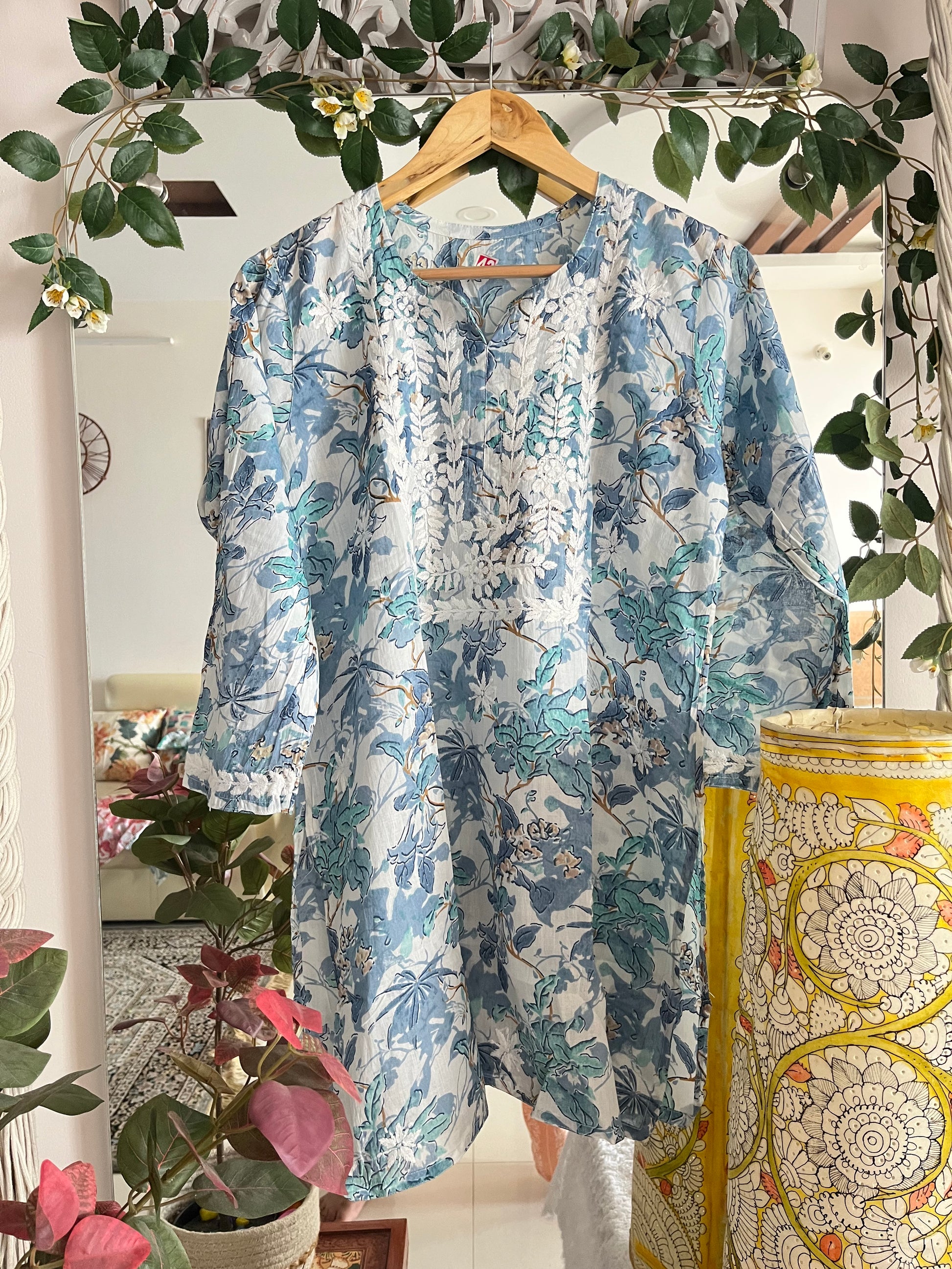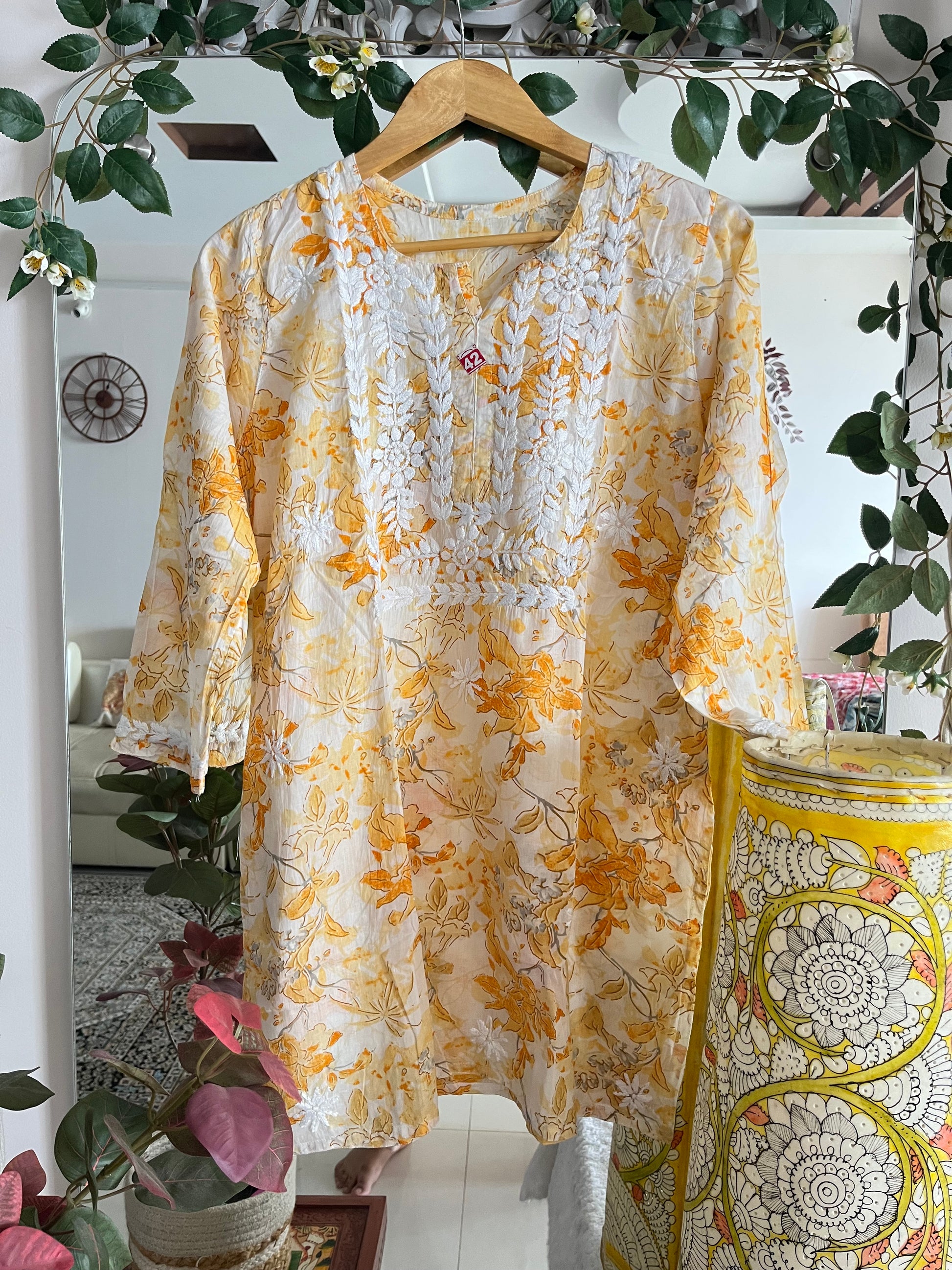 - Mahi mul short kurta crafted from printed mul fabric featuring exquisite chikankari 3D handwork
