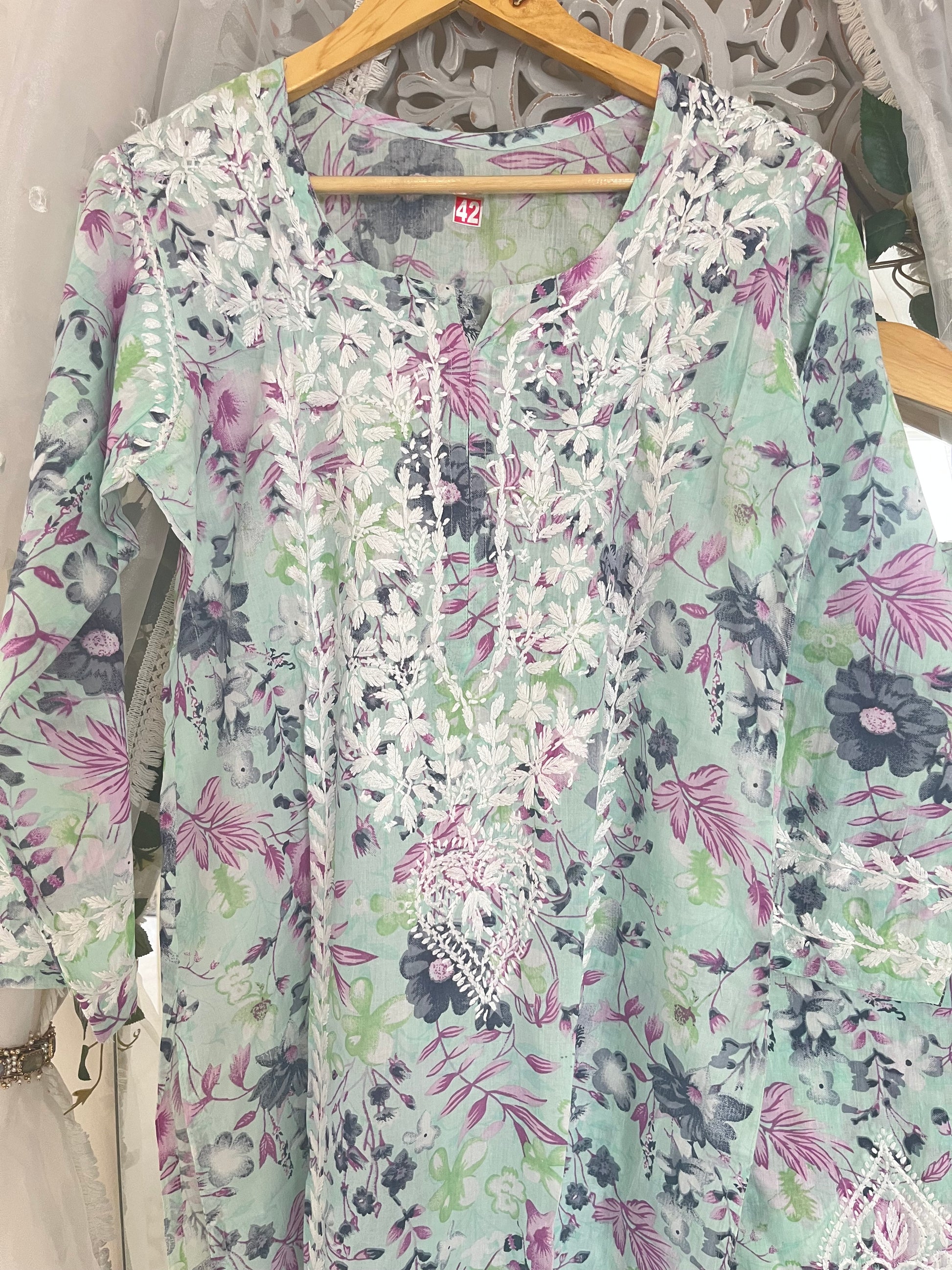 • The Palazzo: Matching printed Mul bottoms, stitched with a comfortable waistband and finished with heavy Chikankari borders at the hem.